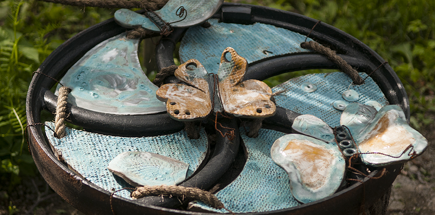 Fågelholkar i alla dess färger och former, tvätt på tork och en rostig fjäril. På konststigen i Gammelstilla kan det dyka upp lite av varje längs promenaden.
